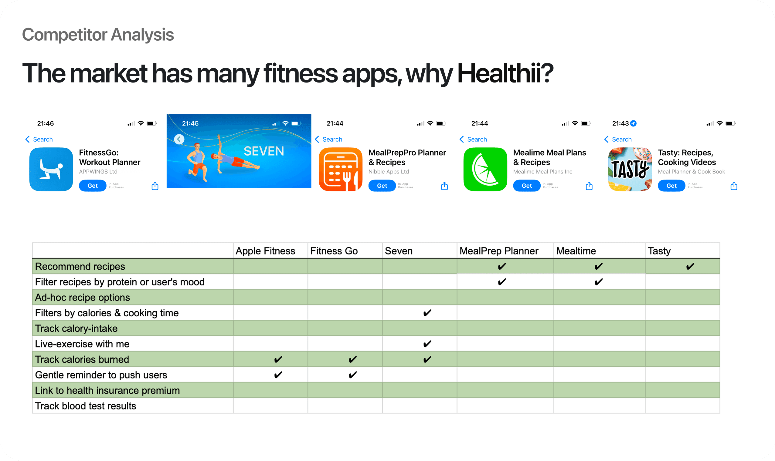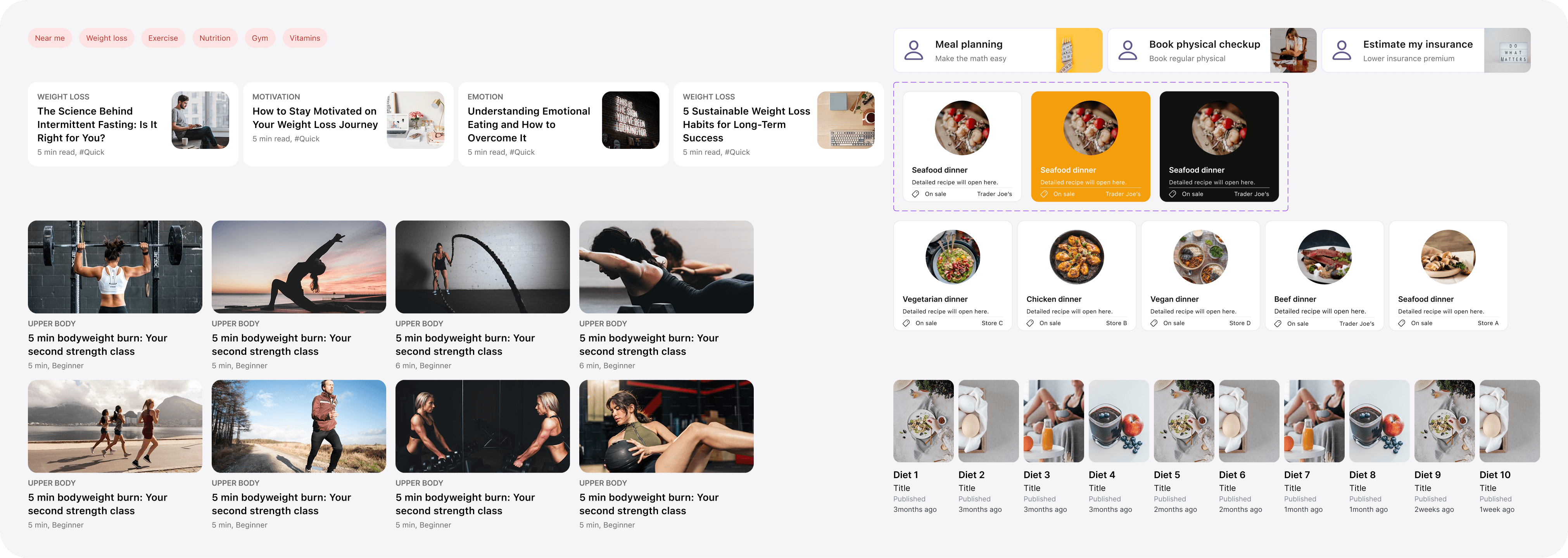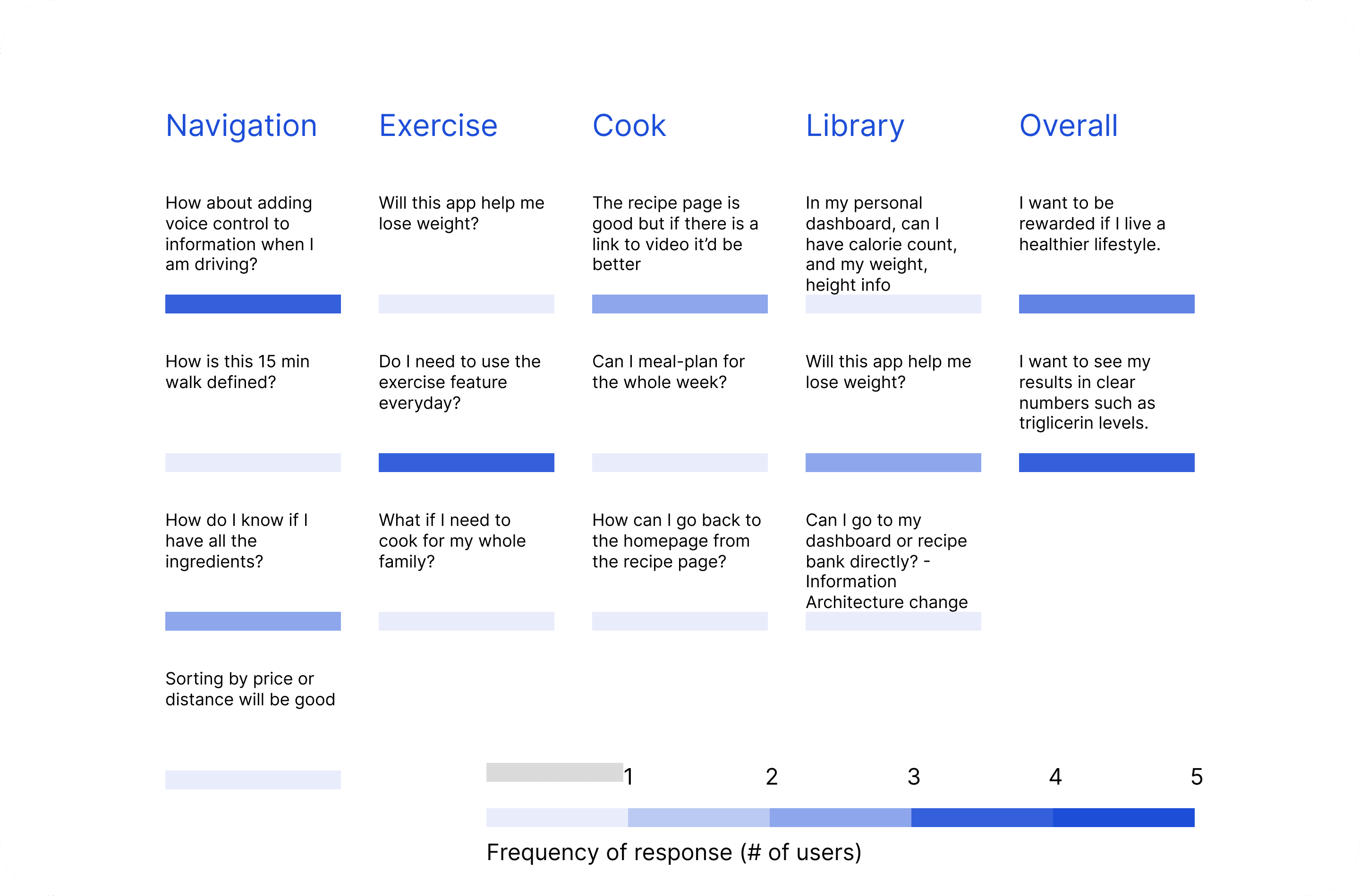 I used mid-fidelity wireframes for initial testing with five users who had varying goals related to healthy eating and exercise. Through this process, I identified several user insights.