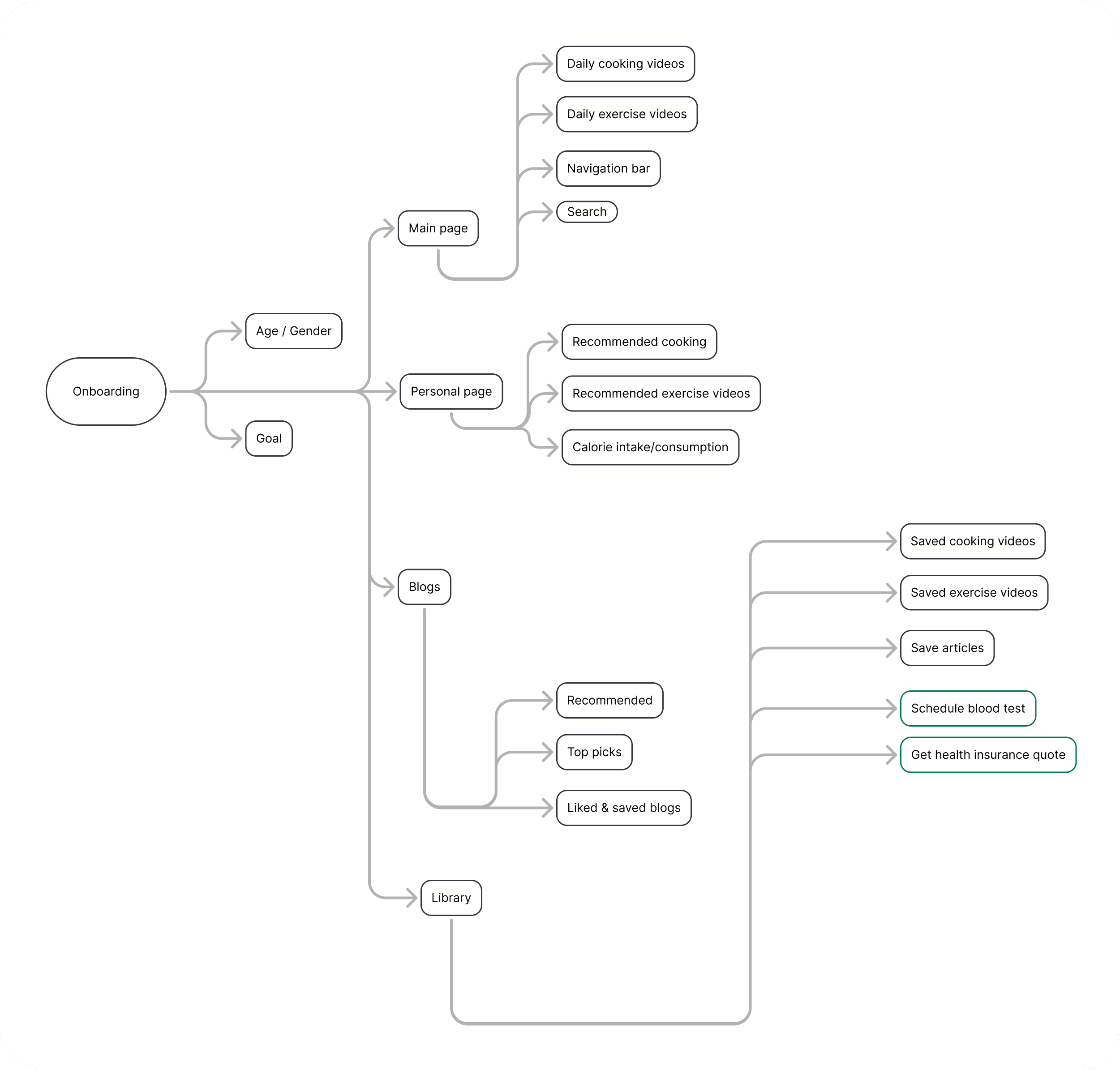 I then developed an information architecture to map the process of finding tips and videos for cooking and exercise. Based on user feedback, I added library feature so users can save their favorite clips.