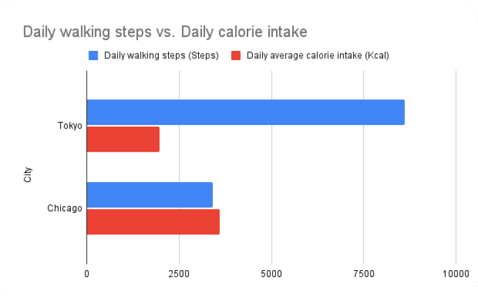 On average, users in Chicago consume 3,600 kcal, while those in Tokyo consume 1,980 kcal daily, roughly twice as much.