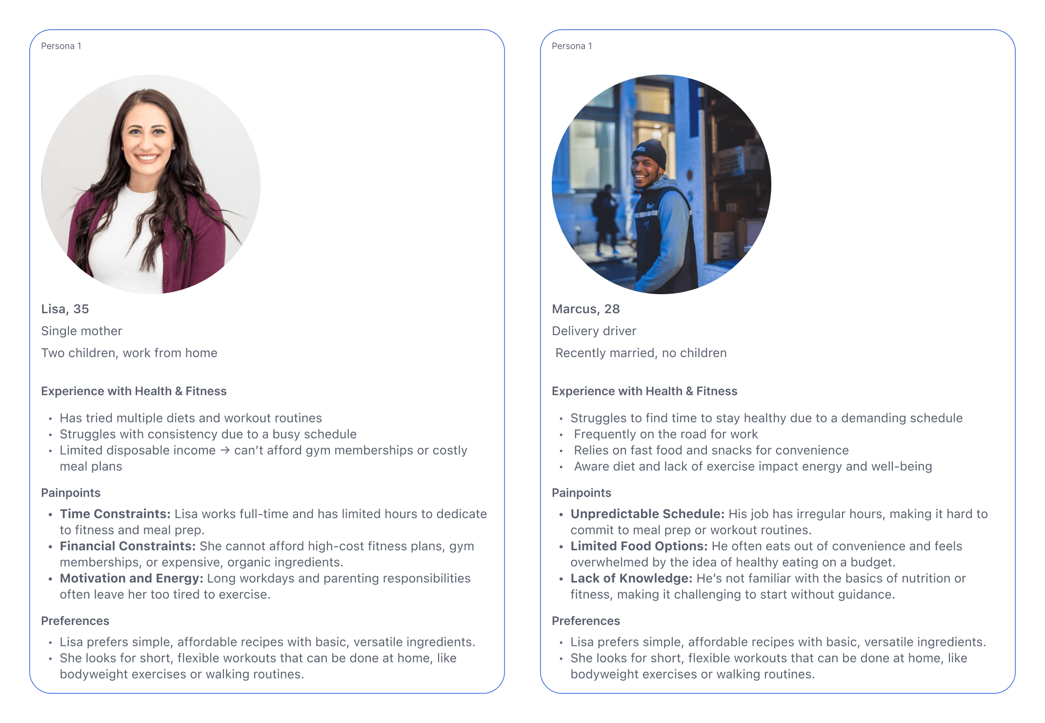 Marcus, a delivery driver: Always on the go, Marcus finds it challenging to prepare home-cooked meals. He mentioned that he typically has only a short amount of time between deliveries and would prefer to use that time for quick, efficient exercise if possible.